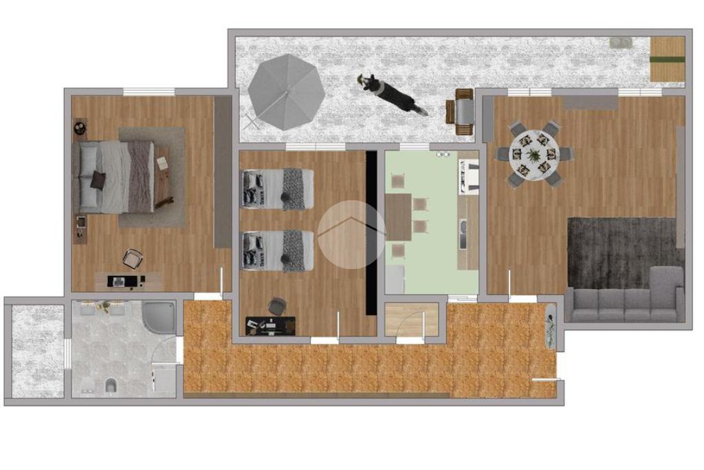 L’appartamento è composto da ingresso in disimpegno, ampio soggiorno, cucina abitabile, due camere da letto spaziose, un bagno con accesso al balcone e un terrazzo vivibile con affaccio sul parco interno, perfetto per momenti di relax all’aperto.